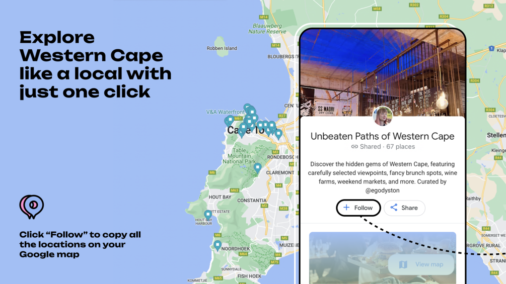 You'll get a Google maps link to a curated map of the coolest local spots of Western Cape. By following it, you install all the locations to your own Google Map